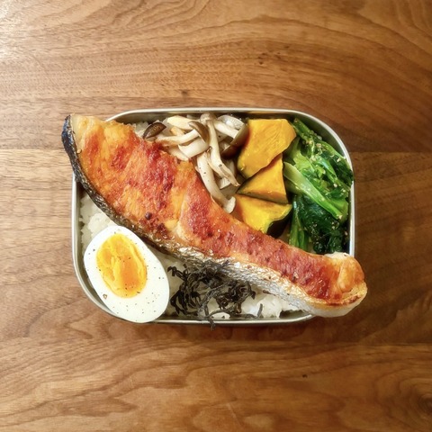 わが家の定番【鮭弁】1食分の材料費を計算してみました。---------------- 【メニュー】焼き鮭、しめじ塩胡椒炒め蒸しかぼちゃ、小松菜の胡麻和えゆで···